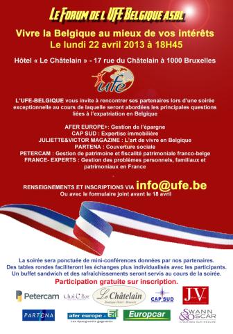 Date: 22/05/2013 l’UFE-Belgique vous invite à rencontrer ses partenaires lors d’une soirée exeptionnelle au cours de laquelle seront abordées les principales questions liées à l’expatriation en Belgique.