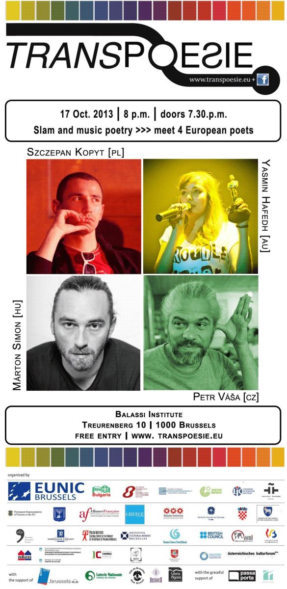 Date: 10/10/2013 - 30/10/2013 Pour assister à l'évènement, veuiller envoyer un mail à l'adresse suivante : info@transpoesie.eu